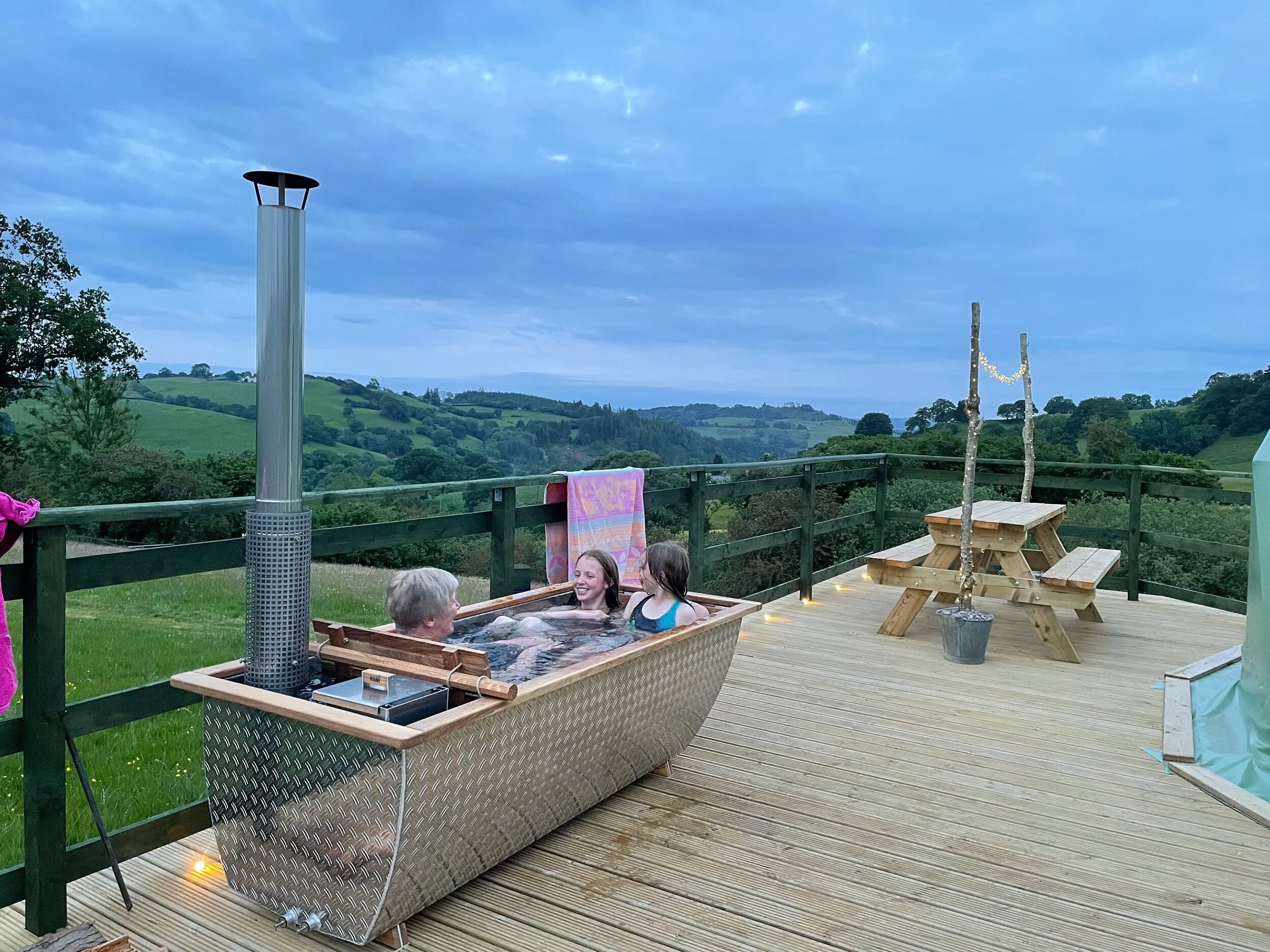 The Hikki hot tub has been a great success. Everyone who has used it over the past few weeks (in all weathers I might add!) has loved it. Its simplicity and the fact that its fresh water seems to be a hit for most but the view is what everyone mentions. Water for the hot tub comes directly from our own well and is pumped from 450ft below the farm. We were so impressed by the Hikki that we’ve bought another one and will be setting it up outside Cadair Berwyn dome in the next couple of weeks!