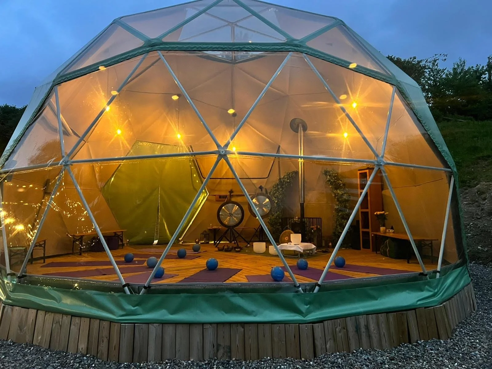 Inside, the dome features a spacious interior with high ceilings, allowing for an airy and open atmosphere. It's equipped with modern amenities, providing comfort while maintaining a connection to the outdoors. Large windows offer fantastic views, and the lighting can be adjusted to suit the mood of the event, whether it be a workshop, yoga retreat, or family celebration.